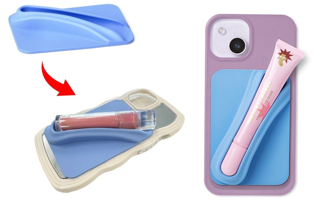 スマホにリップを挟んで持ち運べる便利ホルダー!ケースに貼るだけ、携帯サイズを問わず使えます。