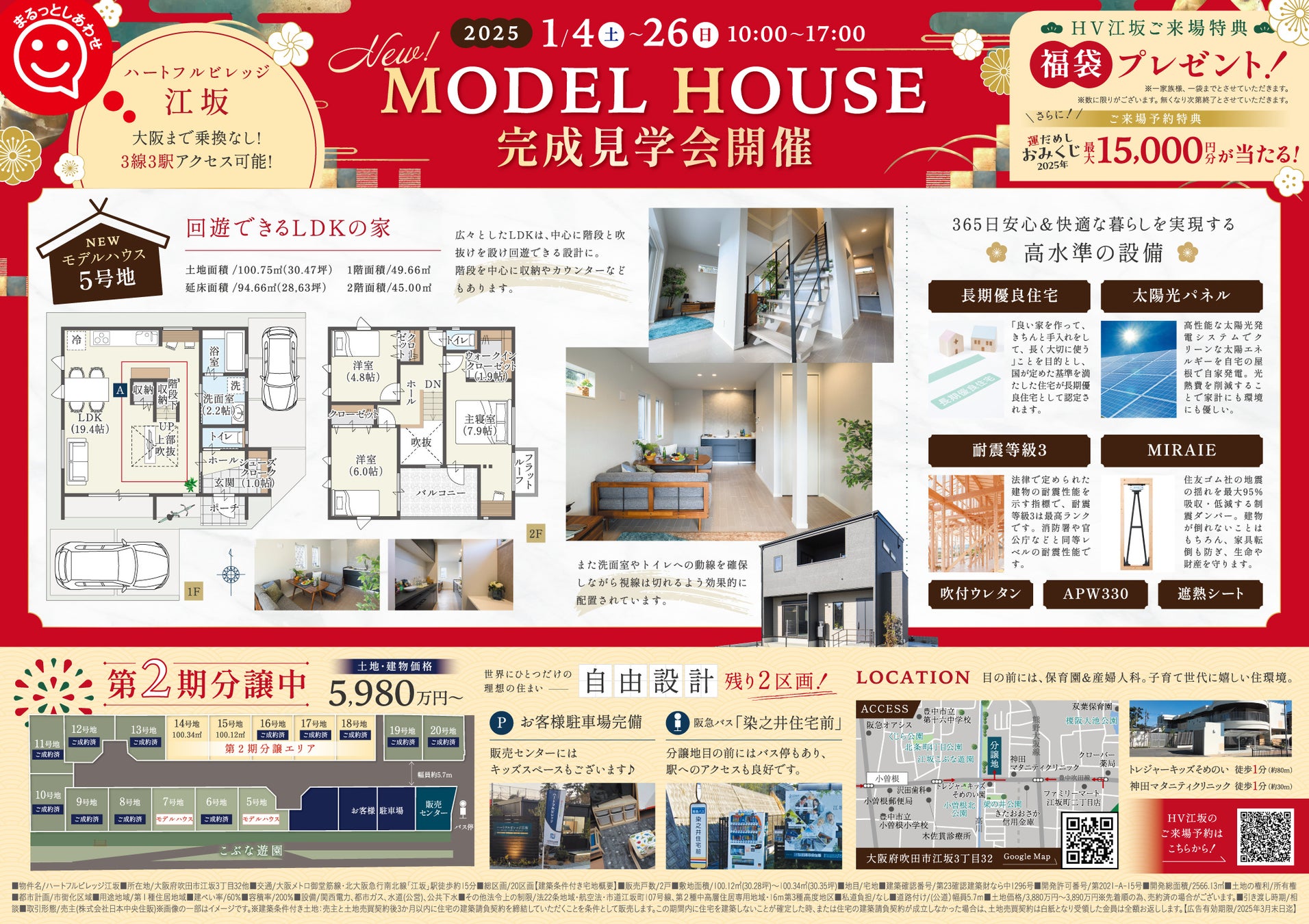 株式会社日本中央住販は、大阪市・吹田市・川西市にある新築一戸建分譲地「ハートフルビレッジ」にて、新春モデルハウス見学会および注文住宅応援キャンペーンを開催いたします。ご来場いただいた方には、特製福袋をプレゼント。さらに、最大15,000円分のギフト券が当たるおみくじのチャンスもご用意しています。この機会に2025年の新しい暮らしを体感してみませんか?