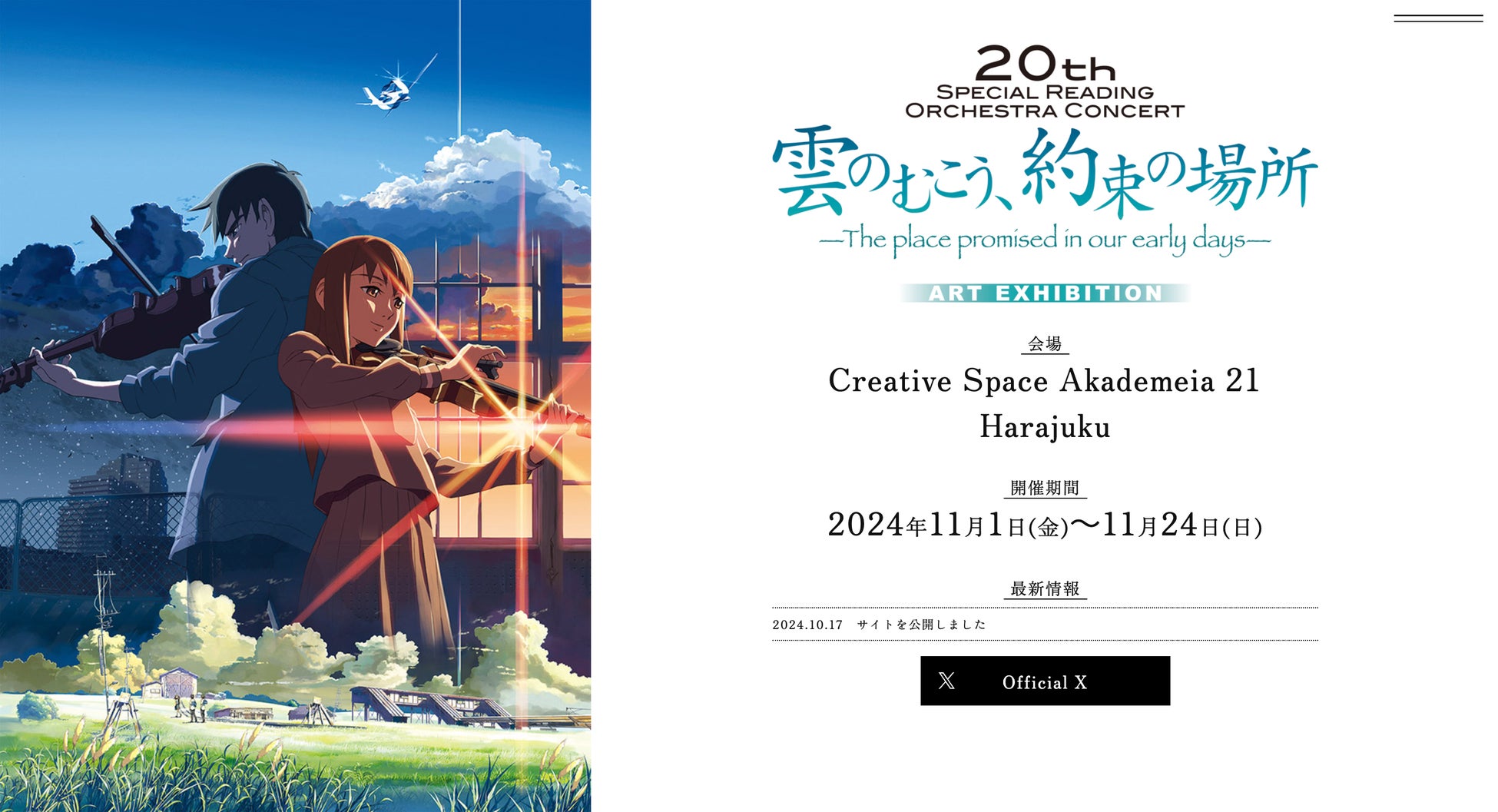 映画公開から20年の時を経て、名シーンのリーディングと、オーケストラによる生演奏・原作映像が融合したイベント「『雲のむこう、約束の場所』スペシャル・リーディング・オーケストラ・コンサート」が開催されることを記念し、本展示会を開催致します。