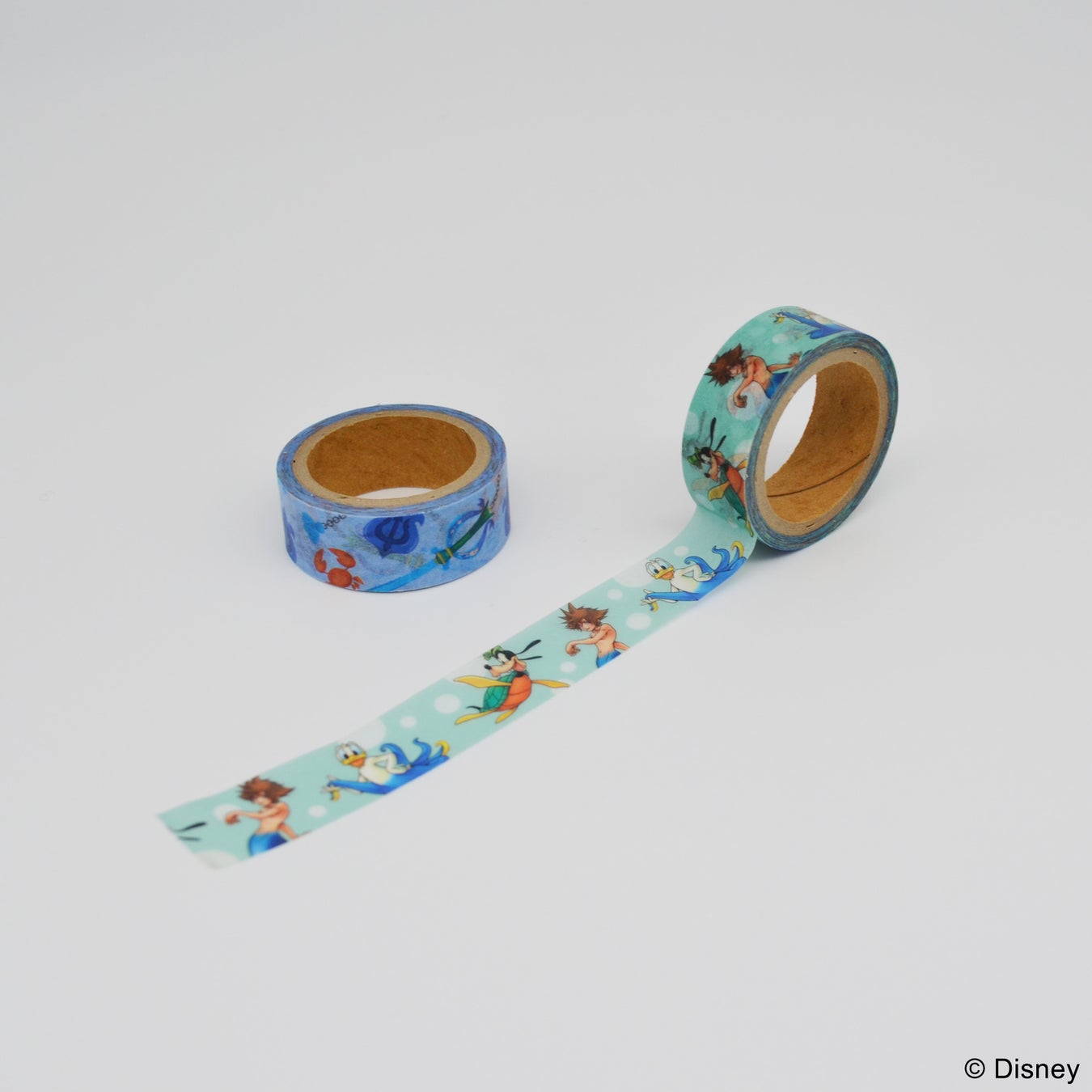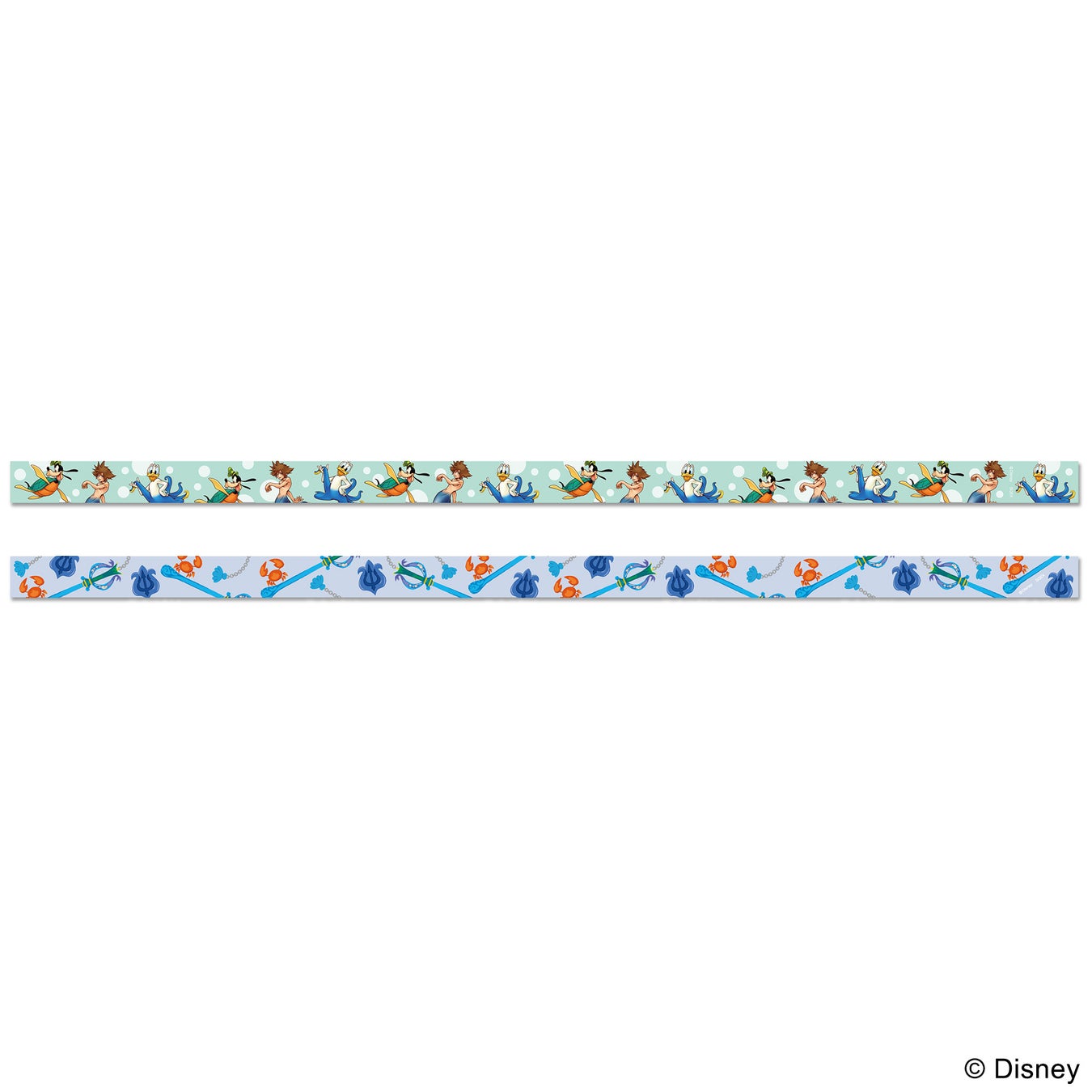 アトランティカ専用の姿になったソラ・グーフィー・ドナルドやキーブレードをあしらったマスキングテープ。2柄のセットです。ノートのデコレーションやラッピングに活躍します。