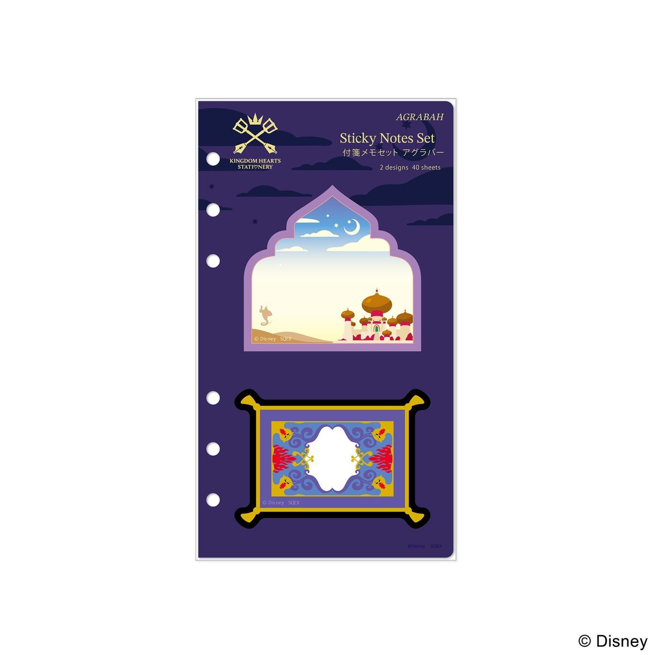 王宮や魔法の絨毯をデザインした紙製の付せんです。ひとことメッセージやメモとして使うことができます。台紙にリング穴があいているため、システム手帳に挟んで持ち歩くこともできます。