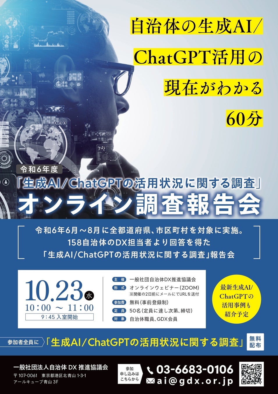 自治体の生成AI活用最前線を知る60分!~158自治体の声から見える未来~「令和6年度 生成AI/ChatGPT活用状況調査」オンライン報告会を10月23日(水)に開催