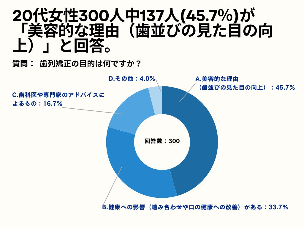 20代女性の45.7%が、歯列矯正の目的は「 美容的な理由(歯並びの見た目の向上)」と回答。【20代女性限定_矯正を考えたことあるかのアンケート】