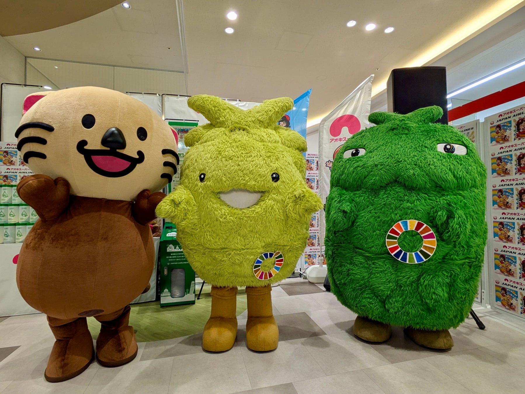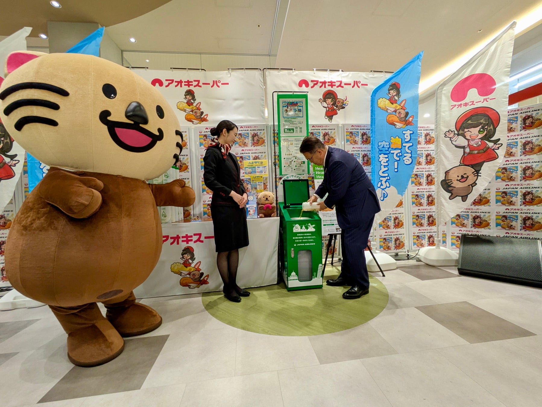 アオキスーパーとJALが実施する『すてる油で空を飛ぼう®』プロジェクトのスターティングセレモニーに大村秀章 愛知県知事とあいちSDGsアンバサダー『モリゾー』・『キッコロ』が参加!