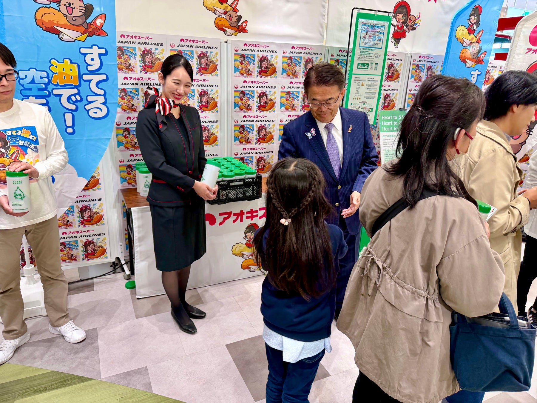 この取り組みは、身近な家庭から出る廃食油を再資源化し、航空機の燃料として再利用することで、CO₂排出削減と循環型社会の実現に貢献することを目的としており、地域の皆様により身近に感じていただけるように各店の回収開始日にJALオリジナルの『UCO(Used Cooking Oil)ボトル』を先着100名にプレゼントする『スタートアップイベント』を両社共同で開催いたしました。