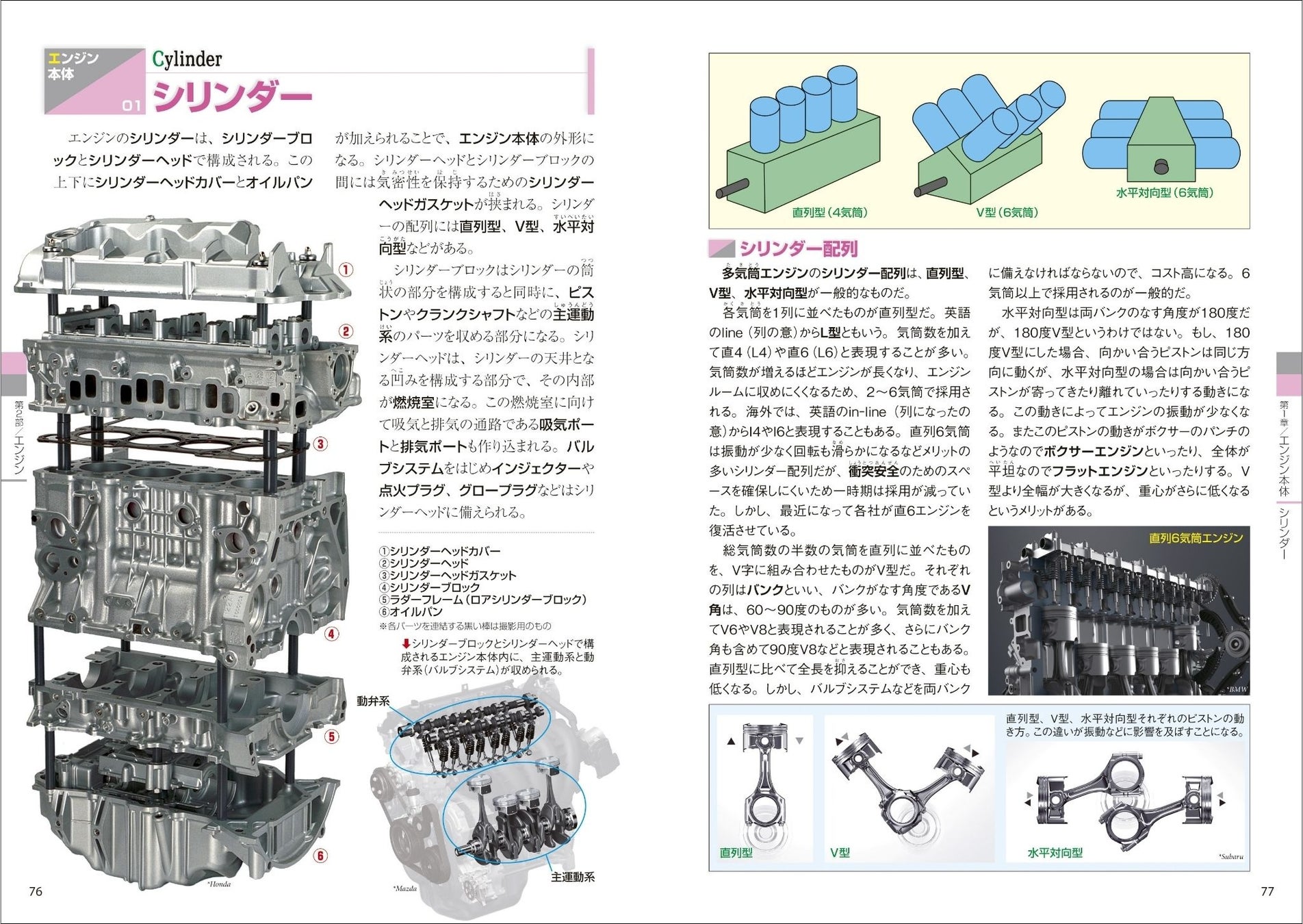 パワートレイン、エンジン、動力伝達装置、電気自動車とハイブリッド自動車、シャシーメカニズムの5部構成。その中をさらに、エンジン駆動、モーター駆動、エンジン本体、動弁装置、吸排気装置、過給機、燃料装置、点火装置、変速機、駆動装置、電気自動車、ハイブリッド自動車、操舵装置、制動装置、車輪といったように細かく章に分け、詳しく、わかりやすく解説しています。