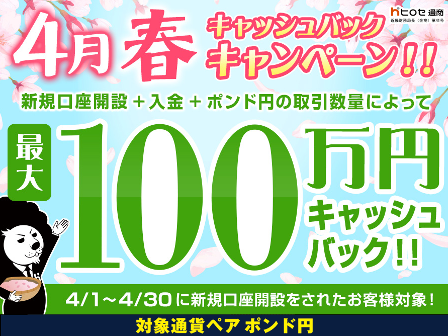 【新規口座開設限定】4月春最大100万円キャッシュバックキャンペーン!を実施