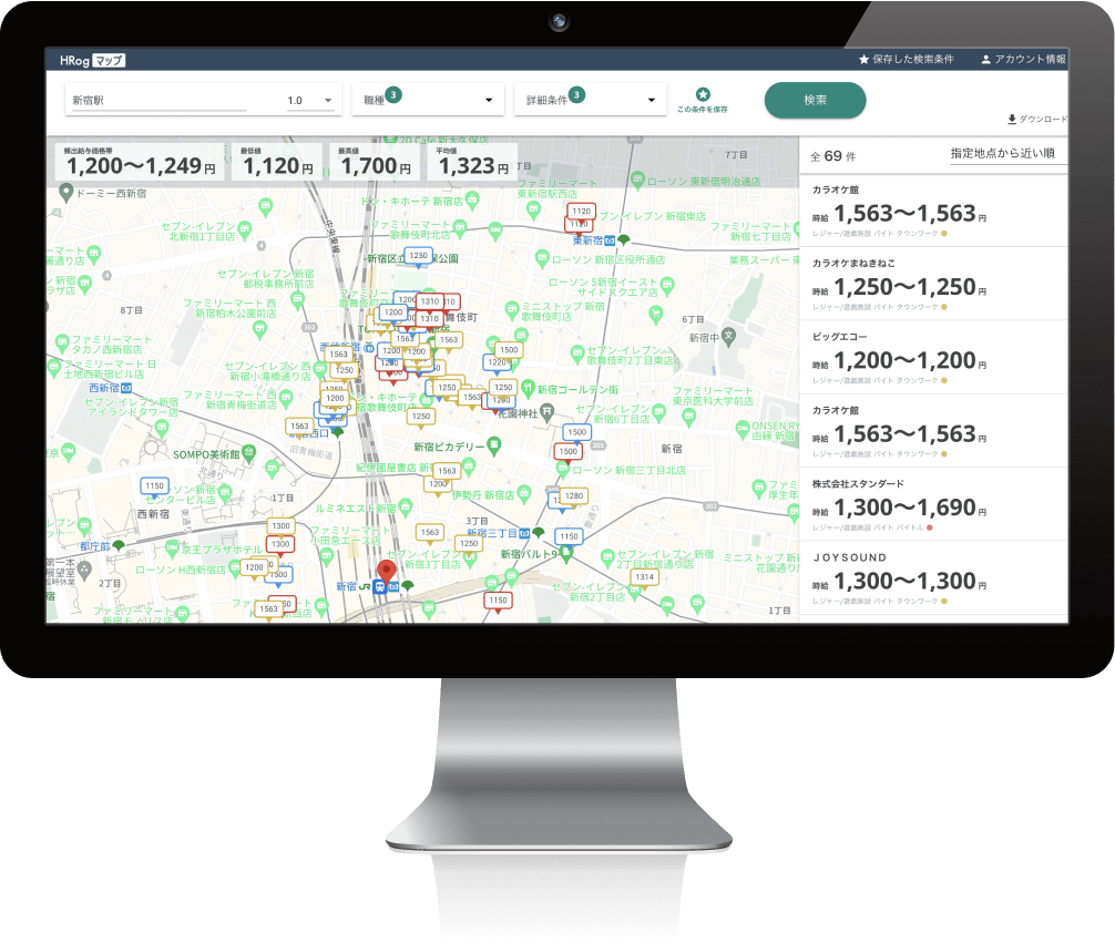 最新の求人情報をGoogleマップ上にマッピングし、視覚的にエリア分析ができる採用支援ツールです。独自収集したアルバイト・パート領域のデータを活用し、指定地点周辺の平均時給や給与レンジなどをスピーディーに表示します。