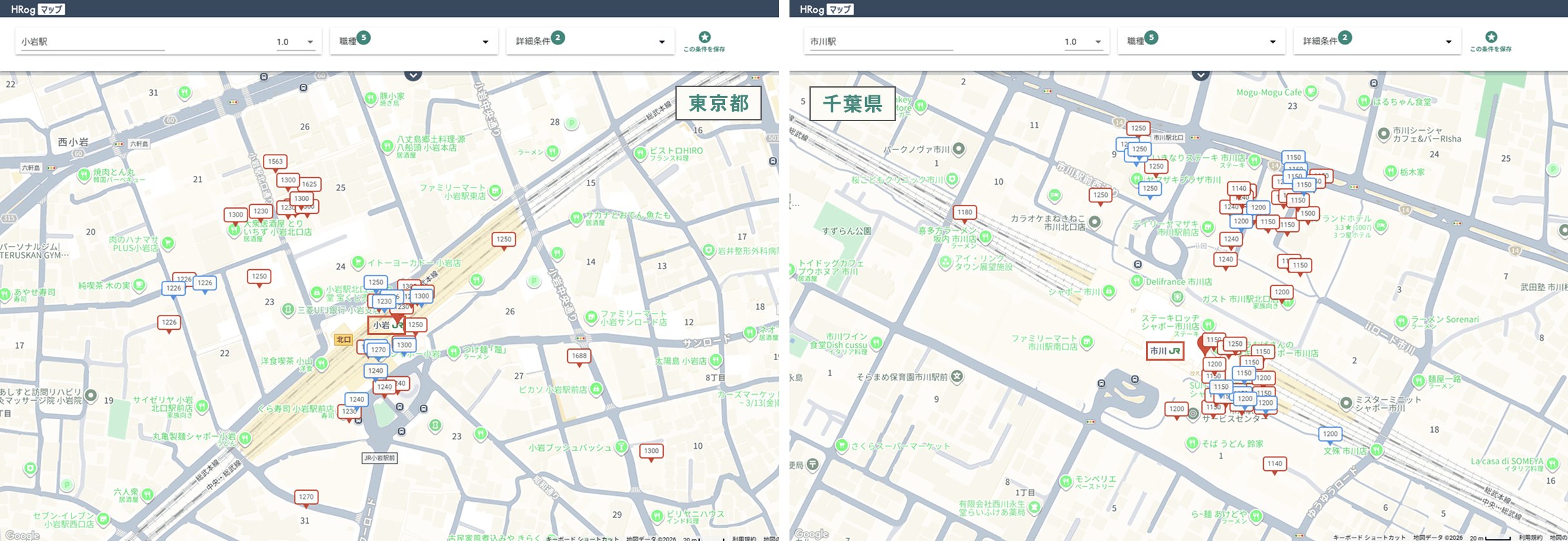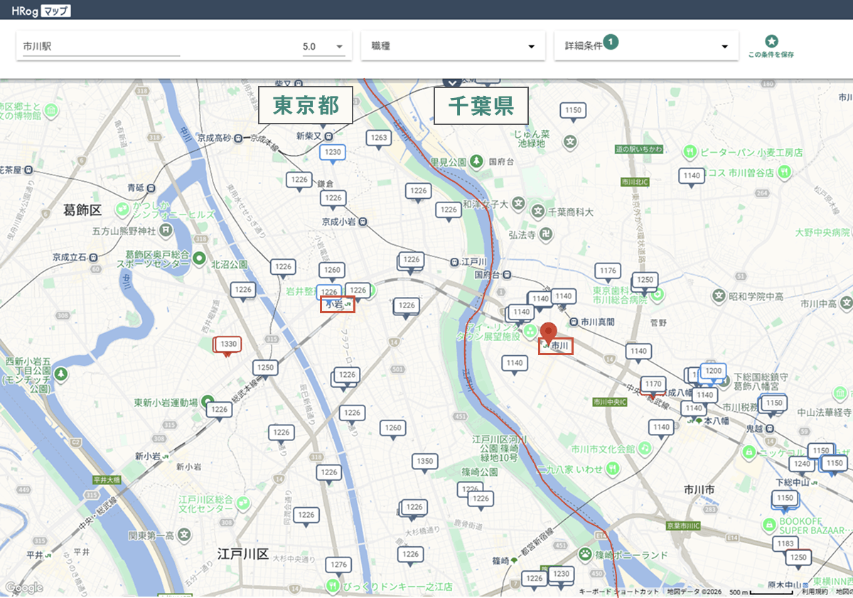 「セブンイレブン」の時給について、東京都と千葉県の県境付近に位置するJR「小岩駅」周辺の店舗とJR「市川駅」周辺の店舗の募集時給を「HRogマップ」を用いて調査しました。