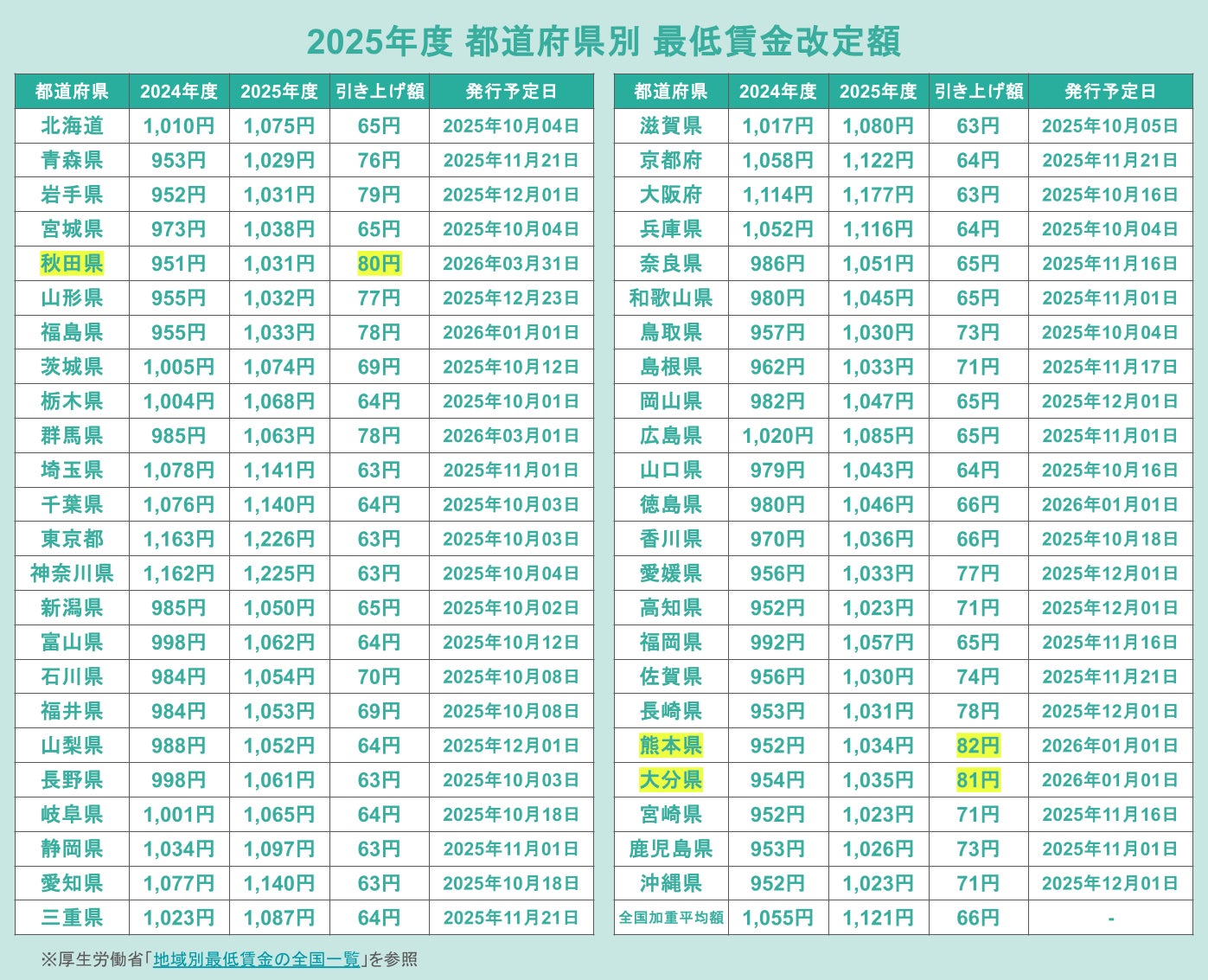 ・2025年度の最低賃金改定により全国加重平均は+66円(+6.26%)と大幅に上昇し、全都道府県で1,000円を突破する