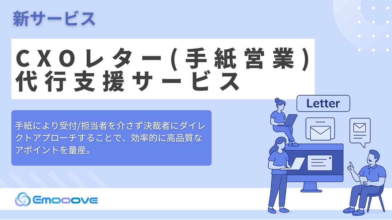 新時代の営業手法を提案する株式会社Emooove(本社:東京都渋谷区、代表取締役CEO:藤澤諒一)は、BtoB営業における決裁者アプローチの課題を解決する『CxOレター(手紙営業)代行支援サービス』を正式リリースしたことをお知らせいたします。