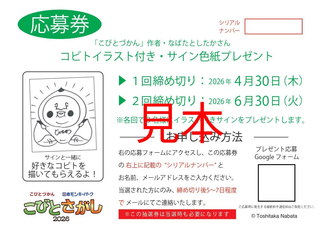 こびと研究家・なばたとしたかさんに好きなコビトを描いてもらえるスペシャル企画(抽選で各期間3名様、計6名様)を実施します。抽選券1枚につき1回、WEBからご応募いただけます。