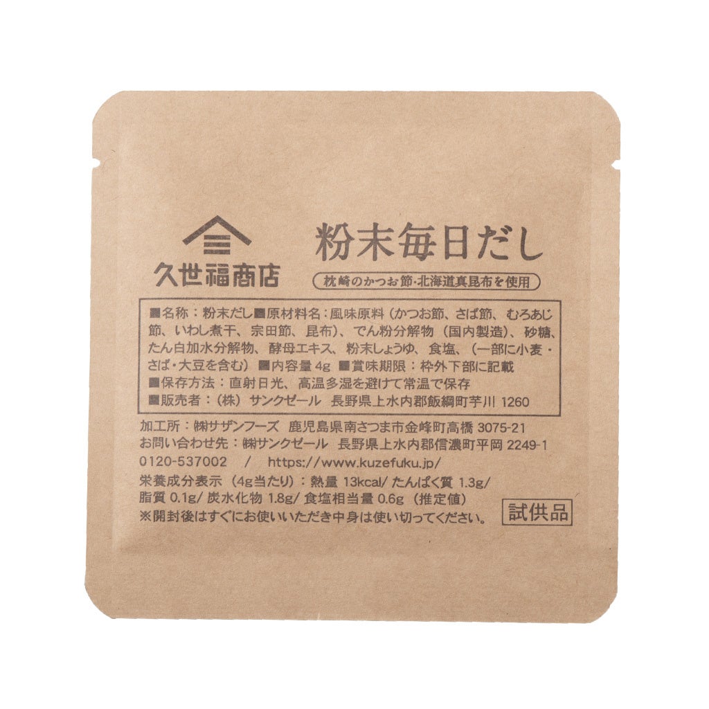 久世福商店の人気商品「素材の、 うまみ引き立つ。 毎日だし」の味わいを、さらに手軽に楽しめる粉末タイプ。使用しているのは、鹿児島県枕崎のかつお節・北海道産の真昆布・むろあじ節・さば節・宗田節。