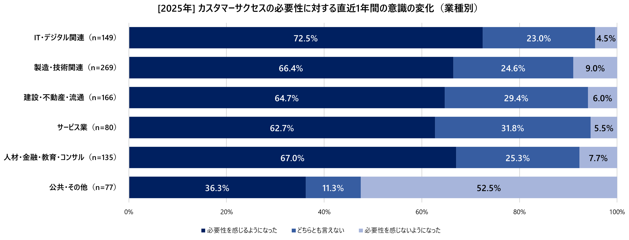 また、サブスクリプション型(サブスク)商材を取り扱っている層では、約8割が「必要性を感じるようになった」と回答しており、サブスクビジネスの収益構造と密接に関連していることが明らかになりました。サブスク商材の取り扱いがない層でも約半数近くは必要性を感じており、サブスクビジネス以外でもリピート購入や顧客満足度向上などの目的で、カスタマーサクセス的アプローチの有用性を感じる企業が一定数存在していることを示唆しています。同時に「どちらとも言えない」と答えた人も4割以上を占め、カスタマーサクセスの必要性について明確に判断できていないケースもあるようですが、継続課金が前提でないビジネス形態では、解約防止やLTV向上といったカスタマーサクセスの価値がまだ顕在化しにくい可能性があります。しかしいずれの層においても、「必要性を感じなくなった」と回答した人は1割以下にとどまっており、カスタマーサクセス自体をまったく不要と考える人は少ないことがわかります。