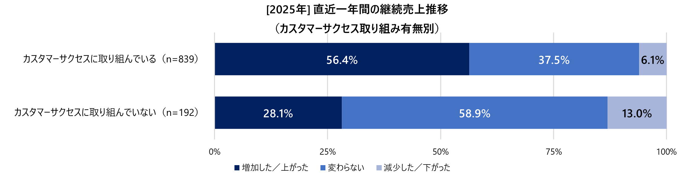 今回の分析の結果、カスタマーサクセスに取り組んでいる企業では、新規顧客数、新規売上、継続売上の各指標で、導入前後の効果が明確に現れていることが分かりました。特に、サブスクリプション型商材を取り扱う企業においては、企業の成長に直結する成果をもたらしていることが際立っています。カスタマーサクセス取り組み企業全体では、売上や利益率、継続率の向上が実感され、既存顧客との関係強化やアップセル施策が、業績の拡大に大きく寄与していると推察されます。一方で、カスタマーサクセスの取り組みを行っていない企業では、各指標ともに「変わらない」との回答が多く、成長の実感が限定的であることが示唆されます。さらに、サブスク商材を取り扱う企業は、カスタマーサクセスの必要性が収益に直結するため、積極的な導入が求められる一方、非サブスク企業では継続課金モデルが存在しないことから、カスタマーサクセス施策の具体的効果が把握しにくく、必要性の認識が分かれやすい傾向があることも明らかとなりました。