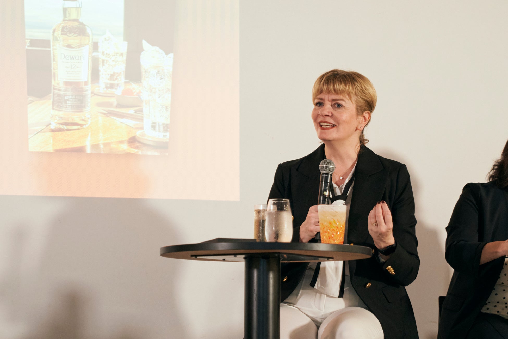 オープニングイベントは司会の挨拶とともに幕を開け、最初にステファニー・マクラウド氏が登壇。新ブランドコンセプト「HERE’S TO THE STORY」に込めた想いや、ブレンデッドスコッチとしての哲学を語りました。