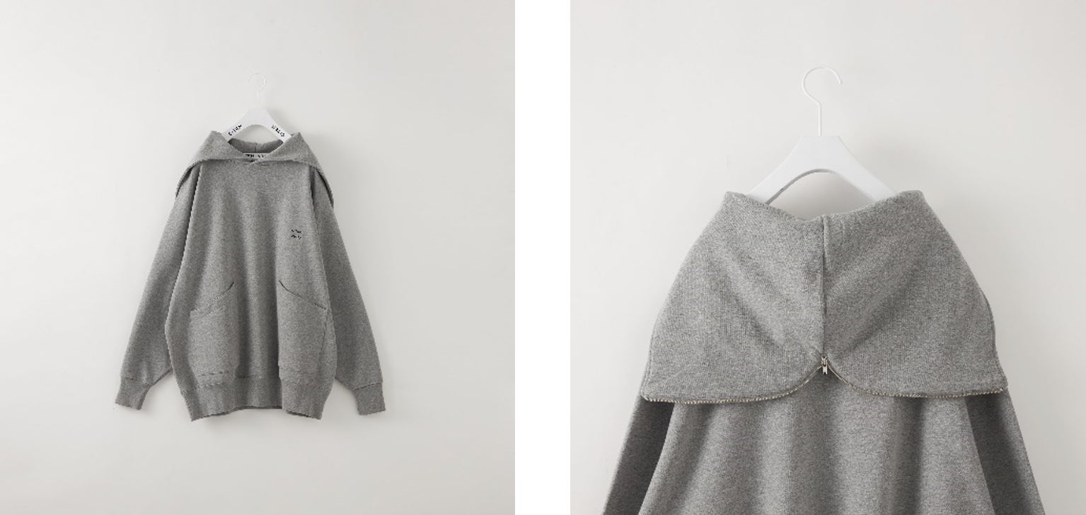 フードのファスナーを開けると、セーラーカラーのように様変わりする個性的なスウェットフーディー。ユニセックスアイテムとしておすすめです。