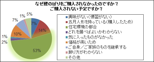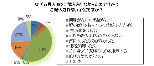 なお、購入しない理由では、五月人形をお持ちでない方の約43%、鯉のぼりをお持ちでない方の約53%が、お住まいの住宅環境のご都合により購入していないと回答しています※3。五月人形においては、「飾るスペースがない」「収納スペースがない」、また鯉のぼりにおいては、「ベランダやバルコニーに設置できない規則がある」「庭がない」「収納スペースがない」という最近の住宅事情が一因となっているようです。