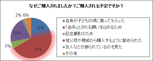 また、購入の理由では、約45%の方が「『由来』とされる願いを込めるため」を選ばれています※3。一般的に、兜や鎧などの五月人形は「お子様の身を守る」として健康を願って、鯉のぼりは「上流の急な流れを鯉が登りきると龍になる」という『登龍門』の故事に由来し、鯉が出世魚と考えられたことからお子様の立身出世を願って、それぞれ飾られるといわれています。