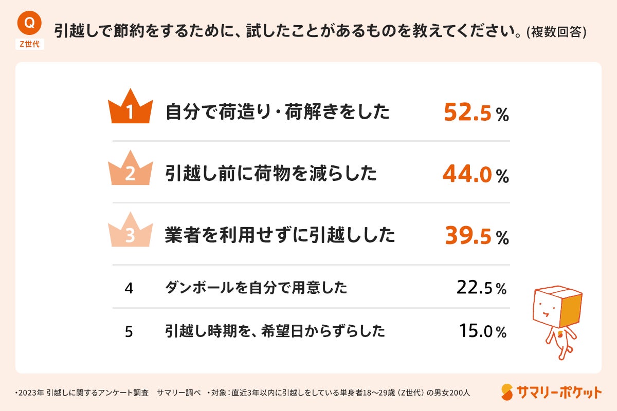 さらにZ世代の8割が引越しコストを減らすために、様々な工夫をしていることが分かりました。例えば、引越し前に荷物を減らした人は約45%、業者を利用せず自力で引越しをする人も約4割います。