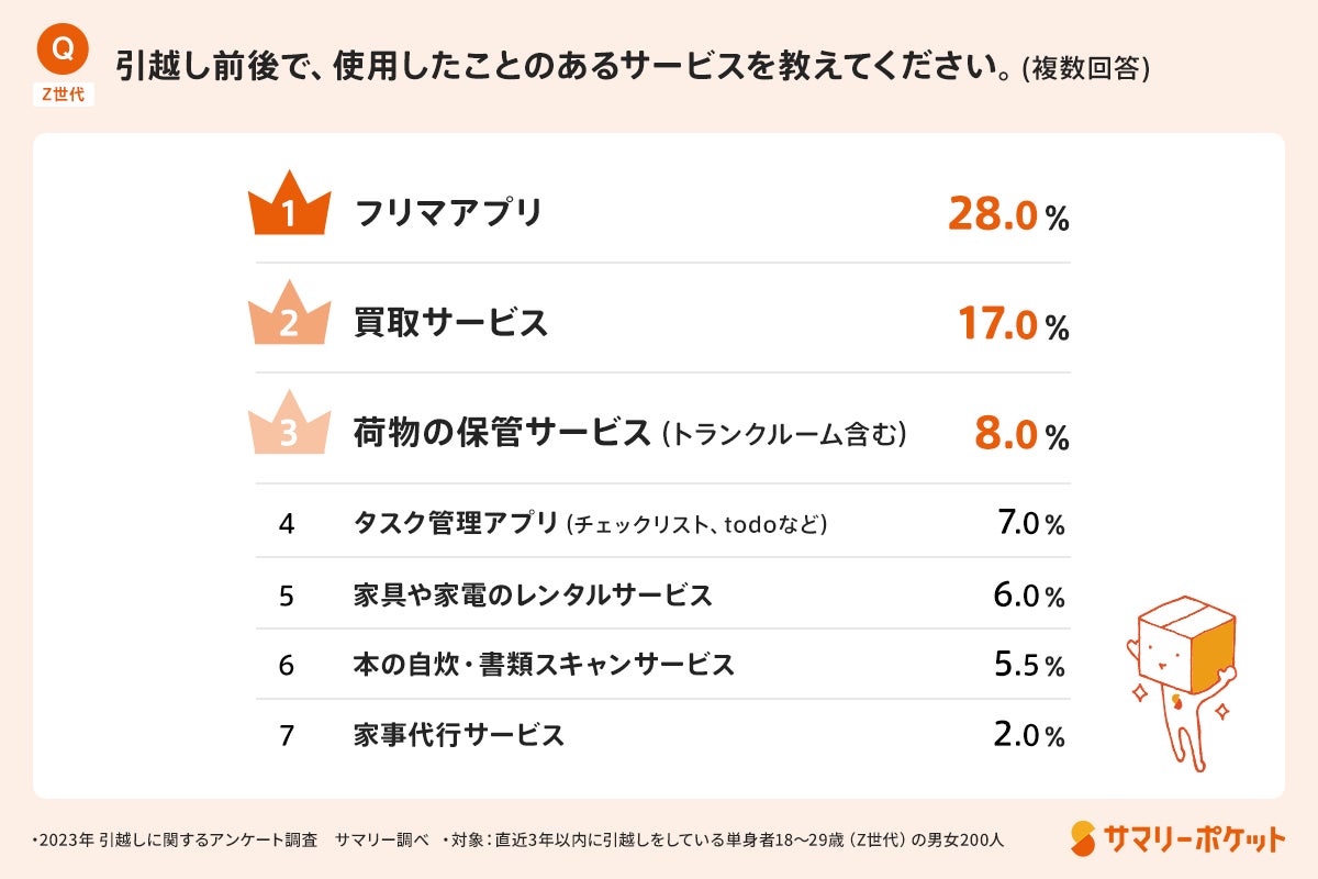 株式会社サマリー(本社:東京都千代田区、代表取締役:日下部康介)が運営する、宅配収納サービス「サマリーポケット」では、荷物の収納・管理に関する市場調査を定期的に行っており、春の引越しシーズンに合わせて「引越しに関する調査」を18歳〜29歳(Z世代)の男女200名を対象に実施しました。