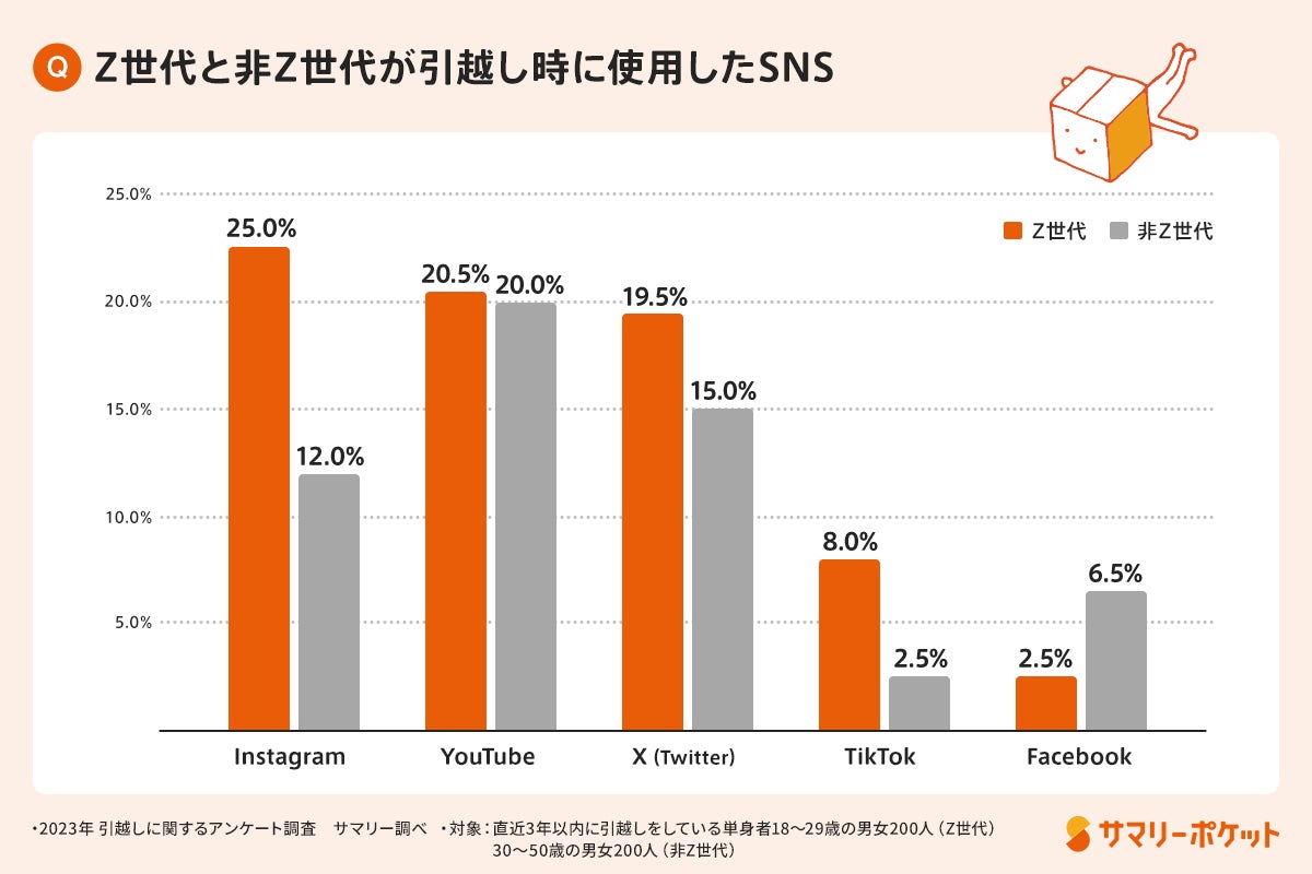 引越し時にYouTubeは世代差なく5人に1人が活用している一方、Instagramは非Z世代と比べ利用割合が10%以上高い結果となりました。