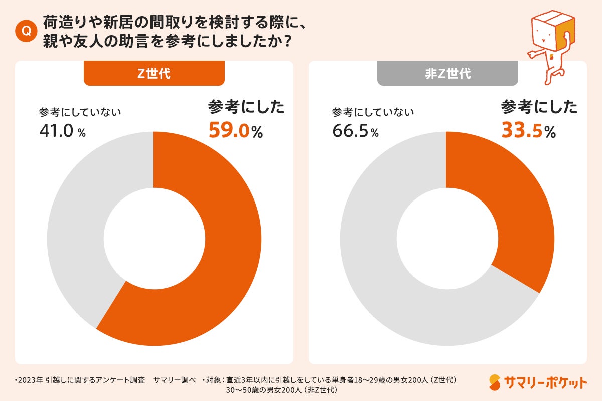 「荷造りや新居の間取りを検討する際に、親や友人の助言を参考にしましたか?」という問いに対して、Z世代の約59%が「参考にした」と回答しています。