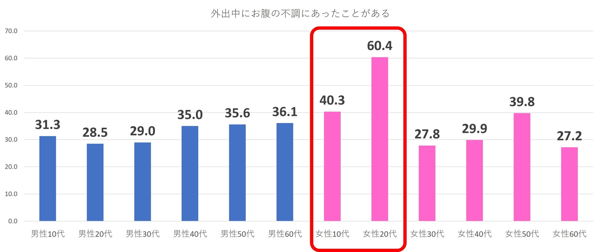 外出時のお腹の不調は10〜20代の女性が約40〜60%と高い傾向