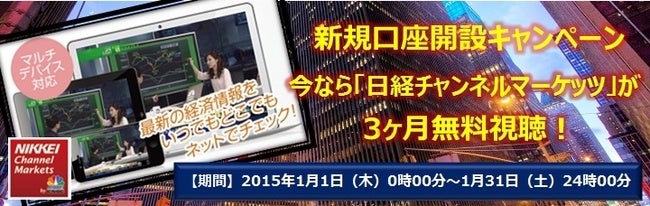 当社では2015年1月1日(木)より新規に口座開設頂いたお客様を対象に、「日経チャンネルマーケッツ」が最大で3ヶ月間無料で視聴頂けるキャンペーンを実施いたします。