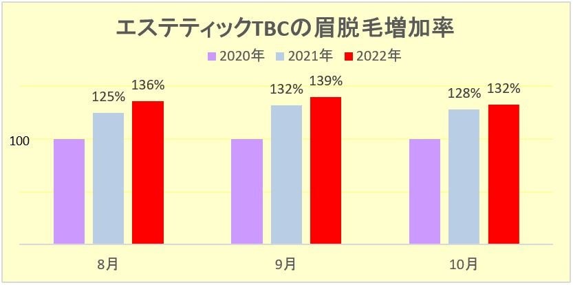 TBCグループ株式会社(本社:新宿区)は、全国に130店舗※を展開するエステティックTBCの脱毛コース利用状況をまとめました。コロナウイルス感染防止対策からマスクの着用が日常化し目元に注目が集まり、マスクで隠れない眉のお手入れが注目されています。TBCでは、眉脱毛の8月~10月の利用率が2020年から年々増加しています。