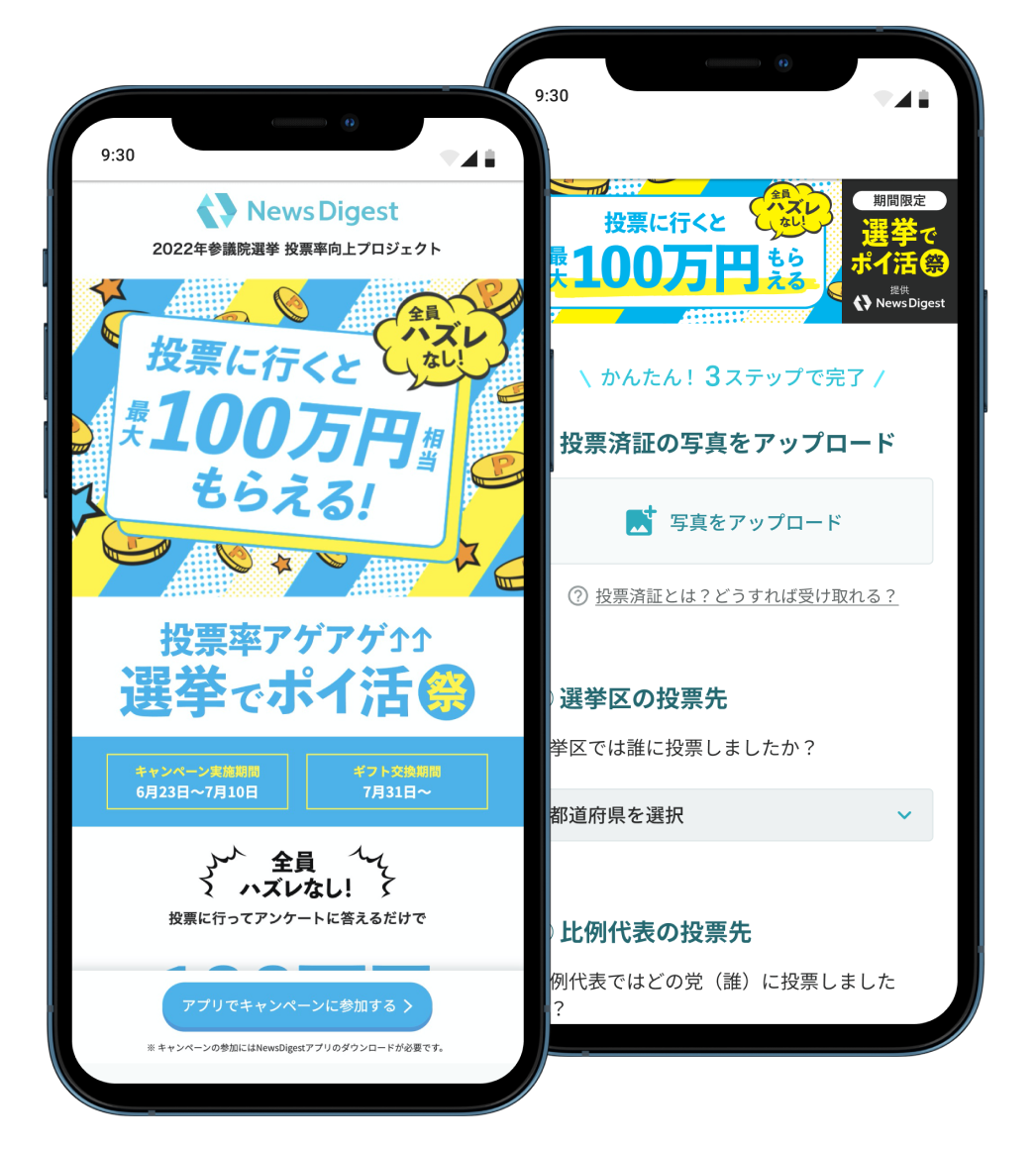 投票に行くと、最大100万円もらえる!NewsDigestアプリ「投票率アゲアゲ!選挙でポイ活祭」を開始