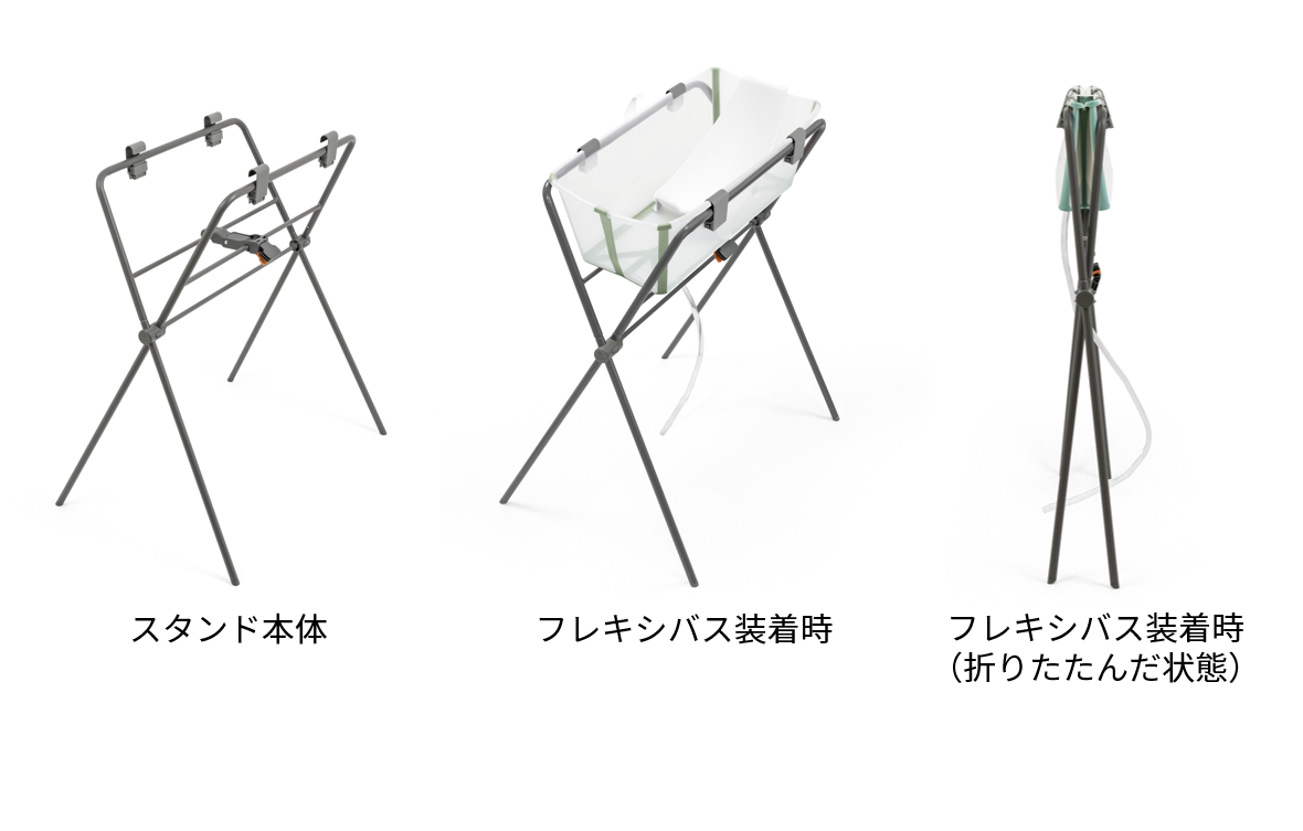 また同時に、フレキシバスを高い位置に固定しつつ排水も簡単にできる専用スタンド「ストッケ フレキシバス スタンド」も発売。フレキシバスを付けた状態でスタンドも一緒に折りたたみができて便利です。付属の排水プラグとホースで排水も簡単。シンクを使えない方や腰痛持ちの方にもおすすめです。