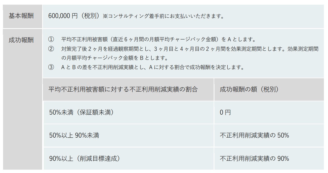 今回リリースする「成功報酬型カード不正利用対策コンサルティング」は、チャージバック※の金額が大きいEC加盟店向けに、成功報酬型で不正利用被害削減のためのコンサルティングを提供し、不正利用額の削減を目指します。