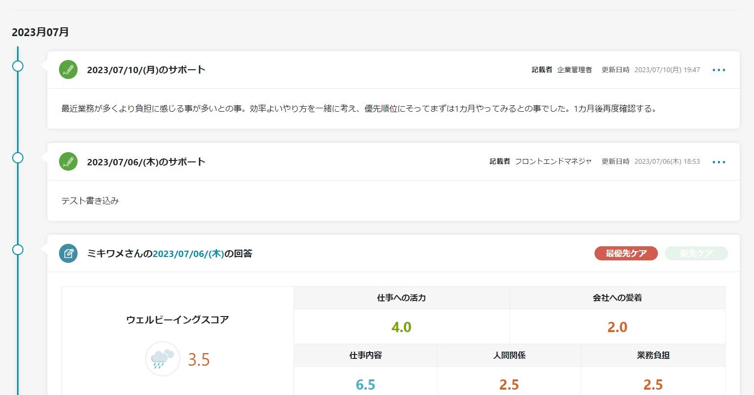 上記画像のように、サポート内容はサーベイ結果と合わせて履歴として閲覧出来るほか、編集することも可能です。