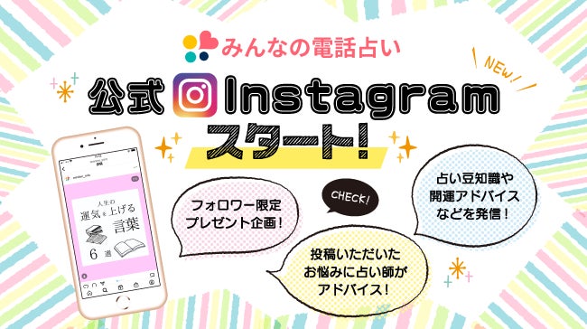 「みんなの電話占い」では、占いにより親しんでいただける機会をご提供するために、公式Instagramを開設いたしました。投稿していただいたお悩みに、所属の人気占い師が無料でワンポイント鑑定をいたします。(鑑定は無料)不定期でプレゼント企画なども実施しておりますので、この機会に是非ご覧ください。