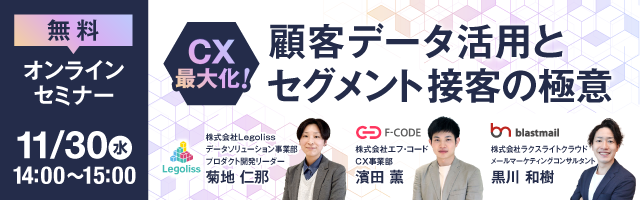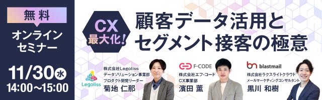 株式会社エフ・コード(本社:東京都新宿区、代表取締役社長:工藤 勉、以下「当社」)は、2022年11月30日(水)に、株式会社Legoliss(本社:東京都渋谷区、代表取締役:澤崎 真樹)、株式会社ラクスライトクラウド(本社:東京都渋谷区、代表取締役:浅野 史彦)と共催で無料ウェビナー『CX最大化!顧客データ活用とセグメント接客の極意』を開催します。
