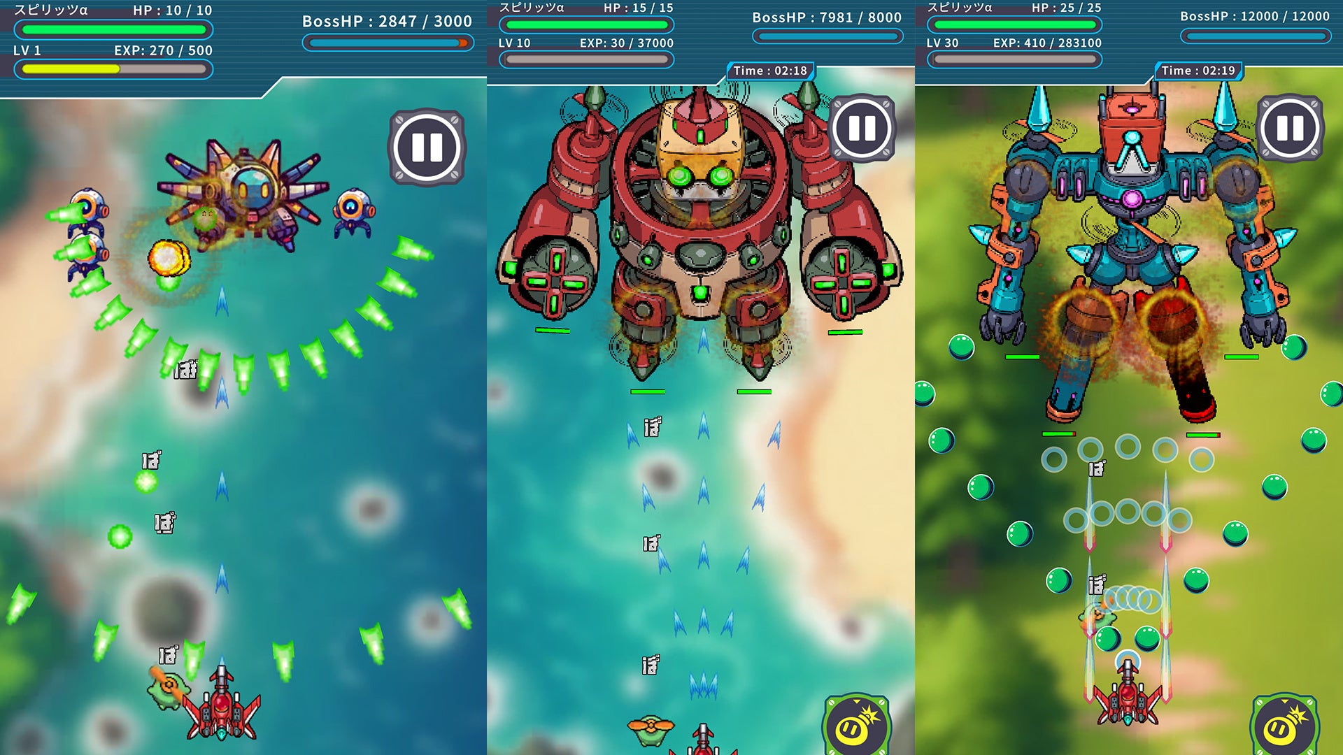 「エアロスピリッツ」は1ステージ約1分と、スキマ時間で気軽に楽しめるシューティングゲームです。レベルアップによる『強化』や『合体』システムにより、機体の強化が可能です。30種類以上の多彩なショットや、強力なスーパーショットを組み合わせて、自分だけの最強機体を作り上げることができます。初心者でも、強化を重ねることにより難関ステージを攻略できます。