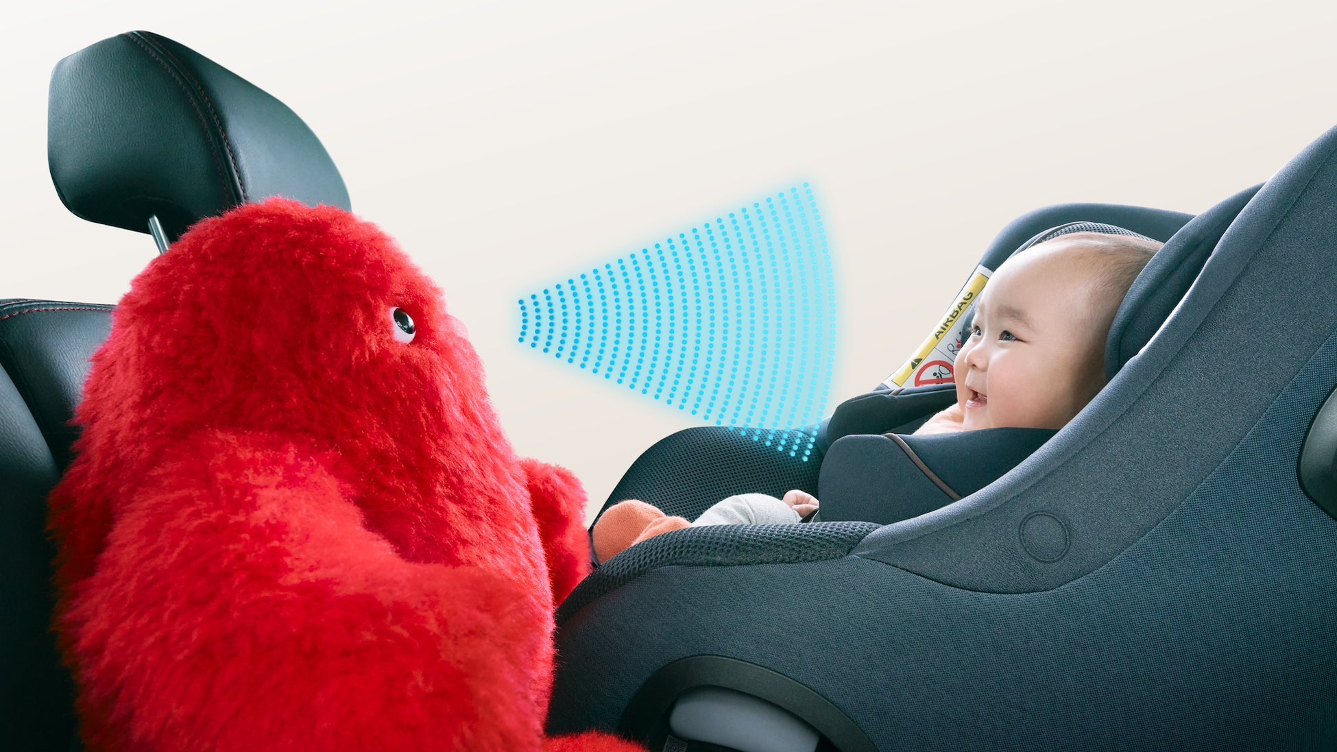 ①「いるよ」「いないいない、ばぁ」「こっちだよ」「お歌を歌うよ」の4つのウェイクワードをベビー イルヨが音声認識。それぞれのウェイクワードに合わせてイルヨが作動し、チャイルドシートに座っている赤ちゃんをあやします。