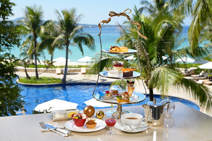プティフールは“一つ一つが小さなクリスマスケーキ”をイメージした6種類をご用意。沖縄県産ヨーグルトを使用した濃厚な「フロマージュのムース」、紅茶の香りが口いっぱいに広がる「琉球紅茶のブリュレ」、シークヮーサーのクリームをベースにした「タルト・タタン」など、沖縄素材の魅力もお楽しみいただけます。また、アグー豚のオープンサンドや、田芋をコロネのツリーに見立てた一品など、セイボリーにも沖縄の食材を活かしたシェフこだわりをラインナップ。青く澄んだ海を眺めながら、特別なひと時をゆっくりとお楽しみください。