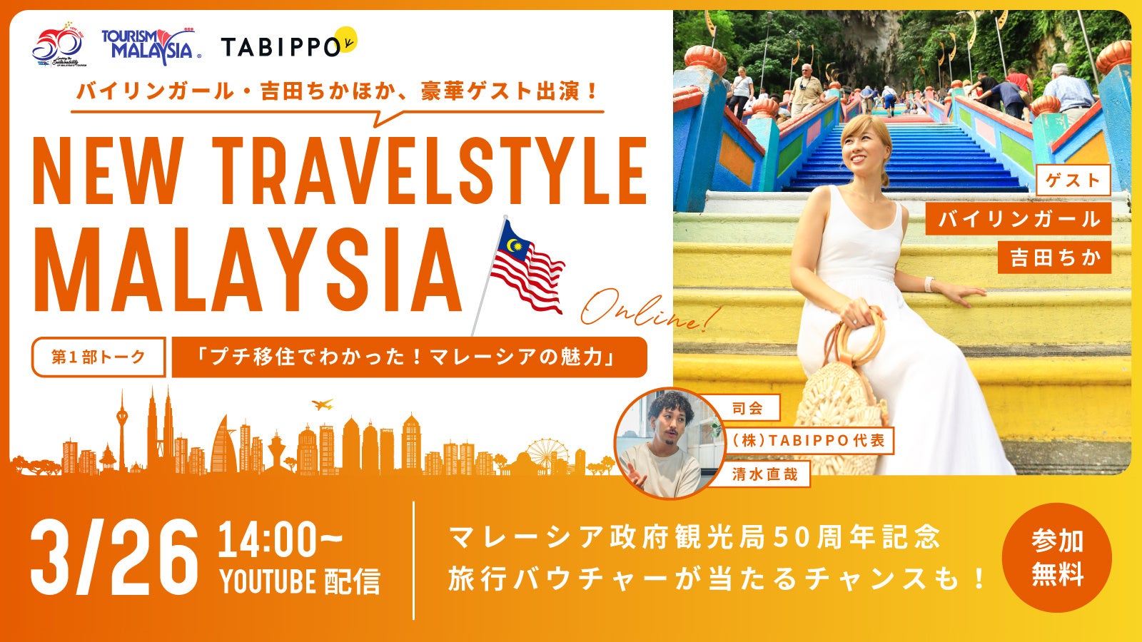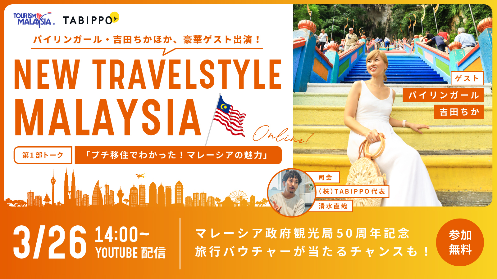 株式会社TABIPPO(東京都渋谷区/代表取締役:清水直哉)はマレーシア政府観光局と共に、無料オンラインイベント「NEW TRAVEL STYLE MALAYSIA 2022」を3月26日(土)に開催いたします。