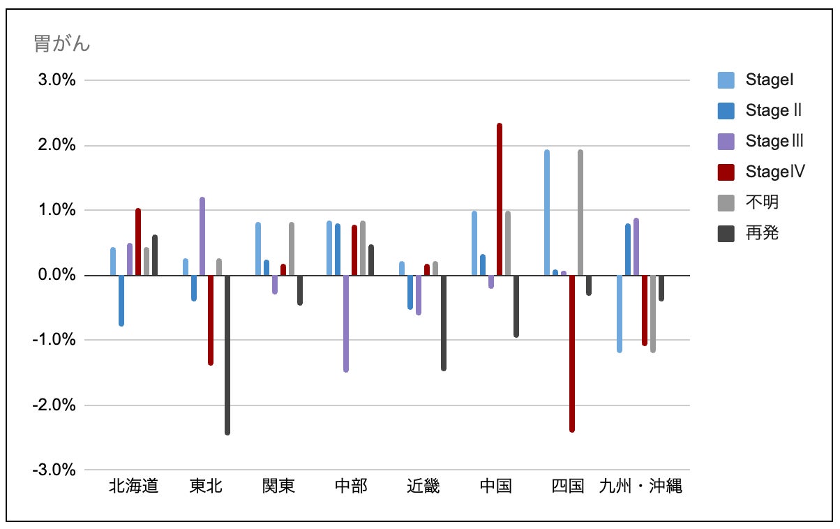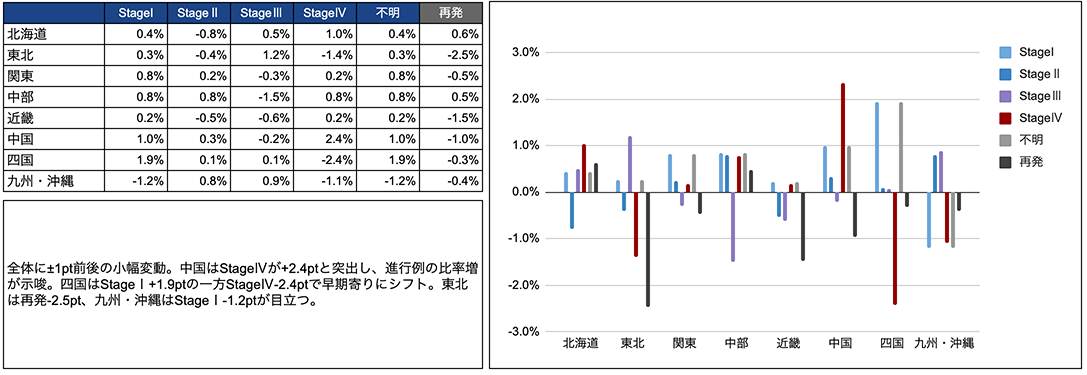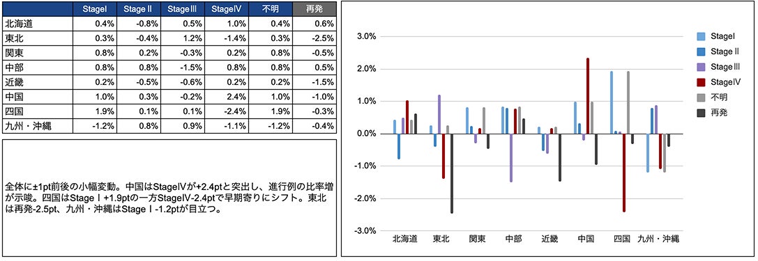 胃がんは地域により差が出ており、四国地方はStage Iが+1.9pt、Stage IVが-2.4ptと早期割合が増加。中国地方はStage IVが+2.4pt(Stage Iも+1.0pt)で進行期の伸びが目立つ。再発は概ね減少で、東北地方-2.5pt、近畿地方-1.5ptが大きい一方、北海道は+0.6ptと微増。