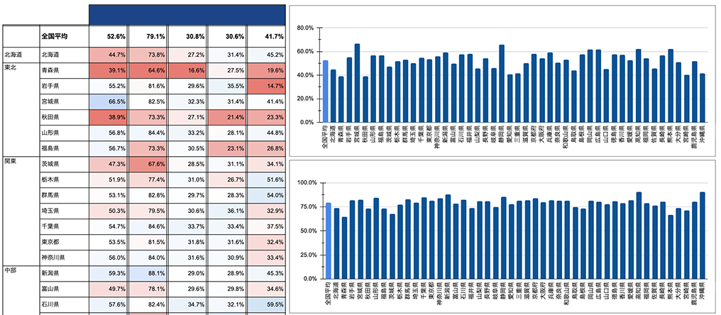 5大がんについて、早期(Stage I+II)で診断された患者の割合を都道府県別に可視化し、地域ごとの傾向を集計したところ、全国平均で「胃がん52.6%、乳がん79.1%、肺がん30.8%、大腸がん30.6%、肝がん41.7%」となりました。(胃がん、肺がん、肝がんについては、ホワイトペーパーにて掲載しています。)