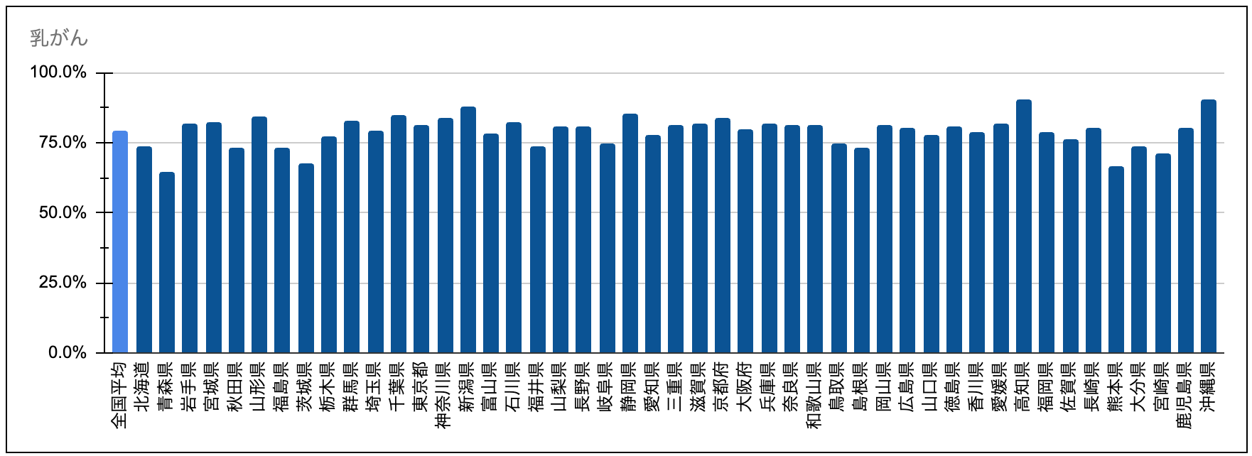 乳がんの早期(Stage I+II)割合は全国平均79.1%と、5大がんの中で最も高水準でした。多くの都道府県で高い割合を示し、80%台後半〜90%台に達する県も見られる一方、青森64.6%、熊本66.4%、茨城67.6%など一部で低い県が確認できます。