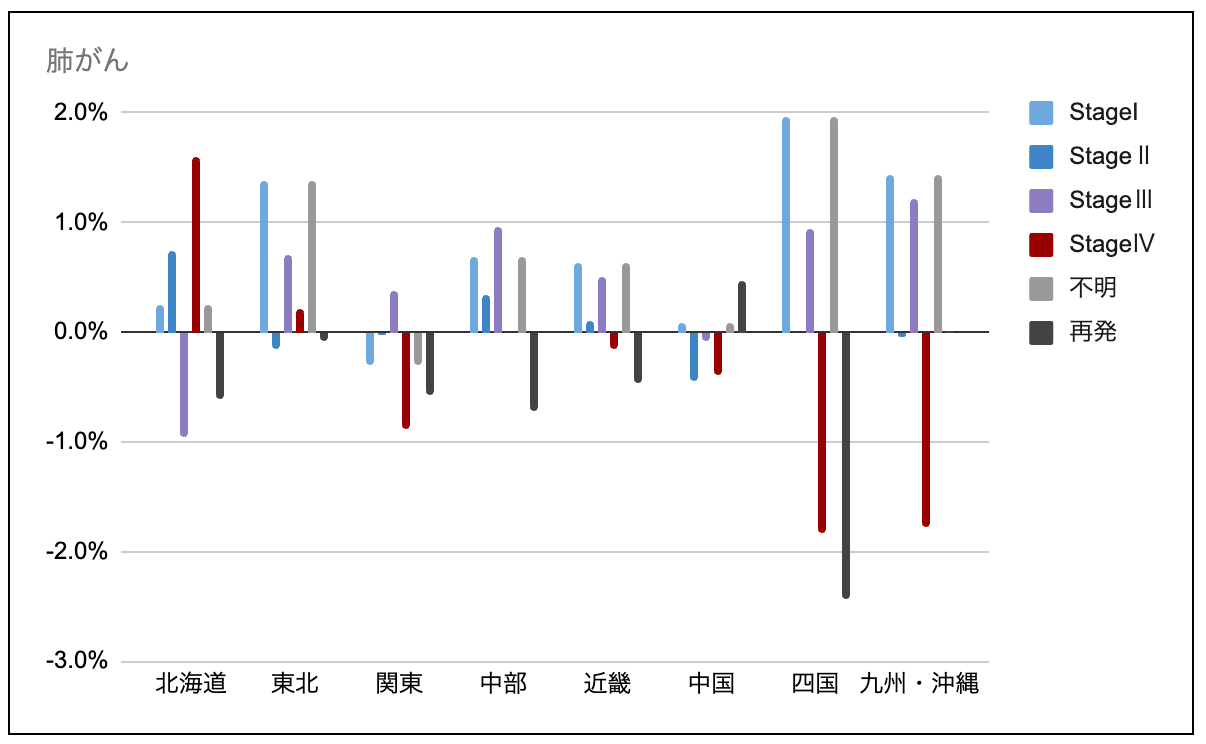 肺がんは全体的にStage Iの増加が広く見られ、特に四国地方+2.0pt、東北地方・九州沖縄+1.4ptが伸長。進行期(Stage IV)は地域差が大きく、北海道+1.6ptと増える一方、四国・九州沖縄地方は各-1.8pt、関東地方-0.9ptで減少。再発は多くの地域で減少し、四国地方-2.4ptが目立つが、中国地方は+0.5ptと増加。