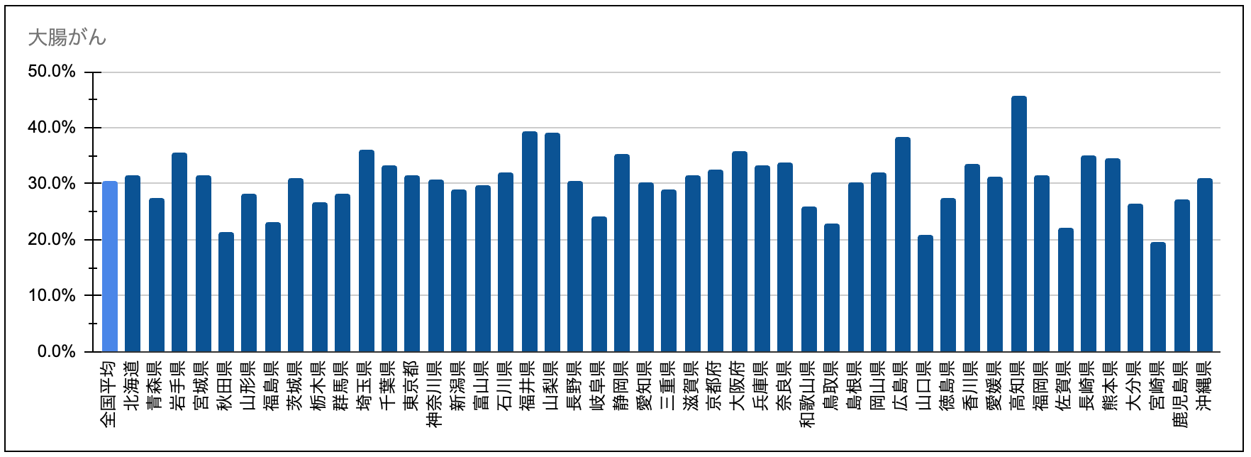 大腸がんの早期(Stage I+II)割合は全国平均30.6%で、都道府県間のばらつきが大きい。高知45.8%を筆頭に、山梨39.2%、福井39.4%、広島38.3%など30%後半〜40%台の県が点在する一方、宮崎19.7%、山口20.8%、秋田21.4%など20%前後まで低下する県も確認できました。