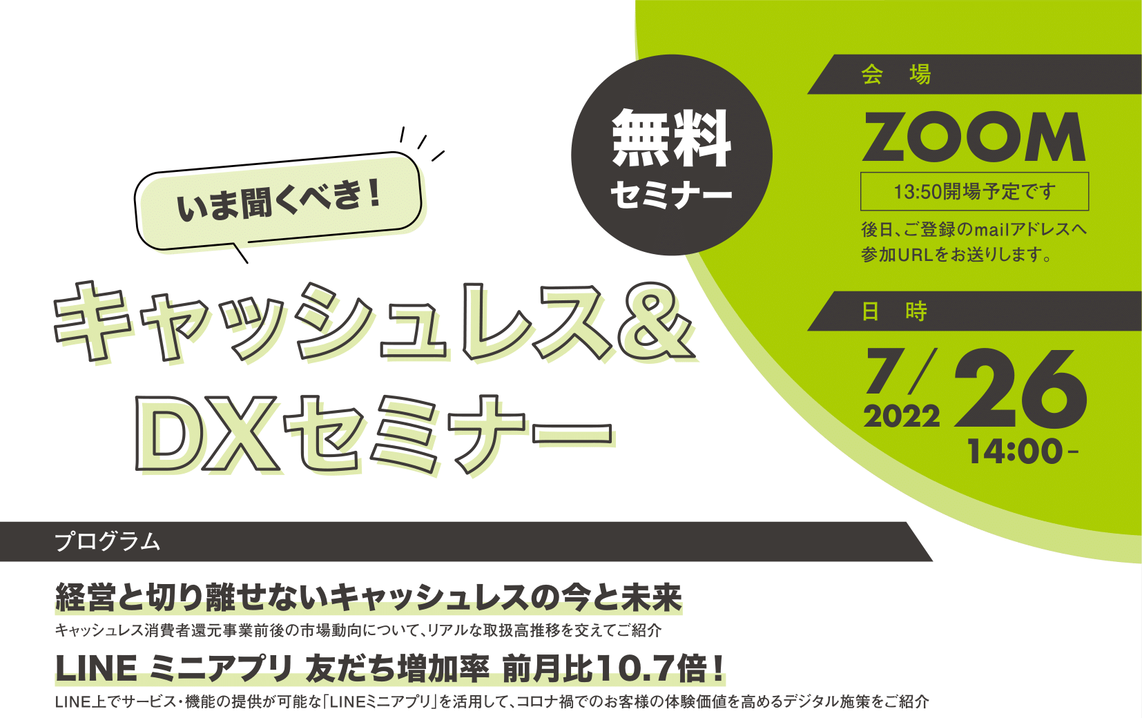 本セミナーでは、「キャッシュレス」と「DX」という2つのキーワードを軸に、前半では「経営と切り離せないキャッシュレスの今と未来」について、キャッシュレスへの関心が大きく高まったキャッシュレス消費者還元事業の前後で市場動向がどう変化したか、実際の数値を用いて解説します。後半では、友だち増加率が前月比10.7倍!にもなったLINEミニアプリを活用したマーケティング手法について、事例を交えてご紹介します。