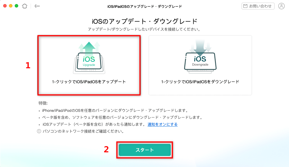 2.AnyFixを起動してから、iPhoneをUSBケーブルで接続して、「iOS/iPadOSをダウングレード・アップグレード」機能を選択します。