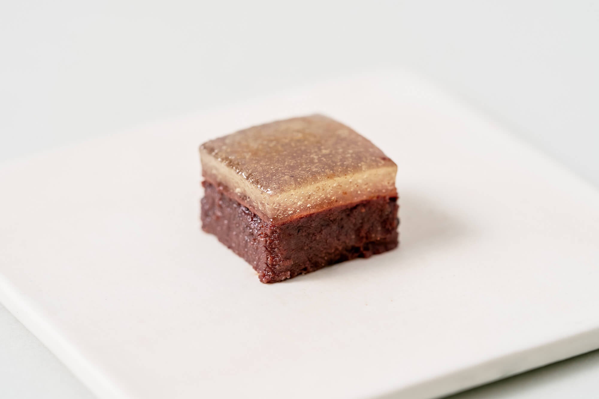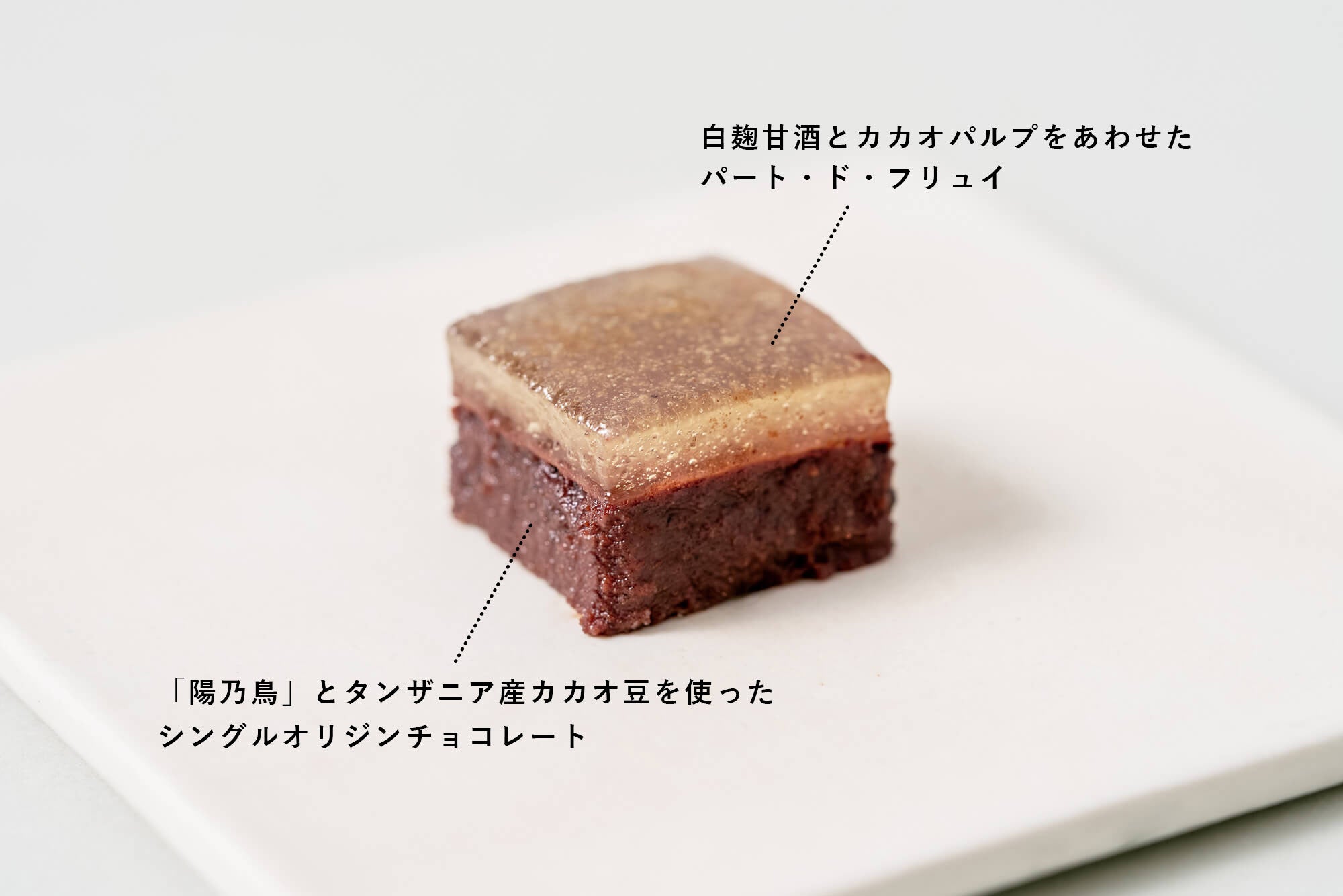 今回上層には、Minimal職人自ら仕込んだ麹からできた酸味と旨味をもつ白麹甘酒と、希少なカカオの果肉であるカカオパルプから成る、酸味とコクを感じるパート・ド・フリュイを使用しました。