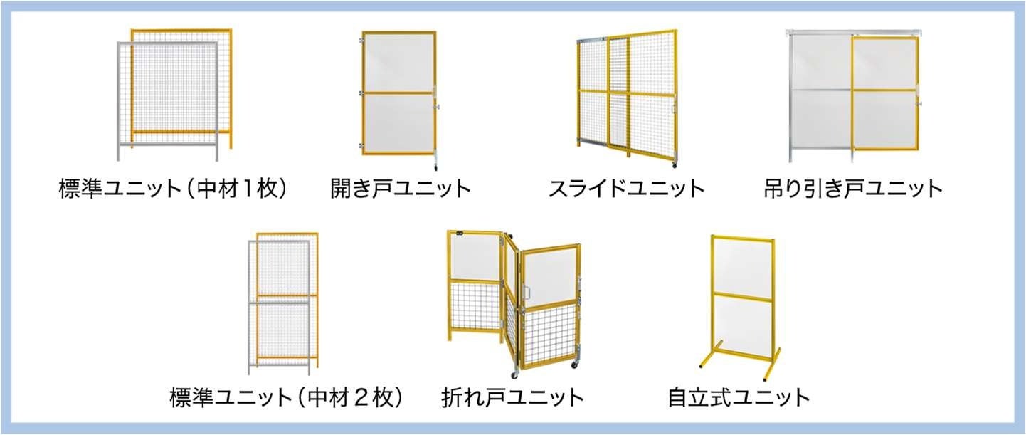 従来の固定タイプだけでなく、パーテーションのように使える自立式の安全柵や折れ戸、スライド扉など豊富に取り揃えております。また、組み立て済みの商品やお求めやすい低コストシリーズも拡充したことによりお客さまのさまざまなご要望にお応えします。