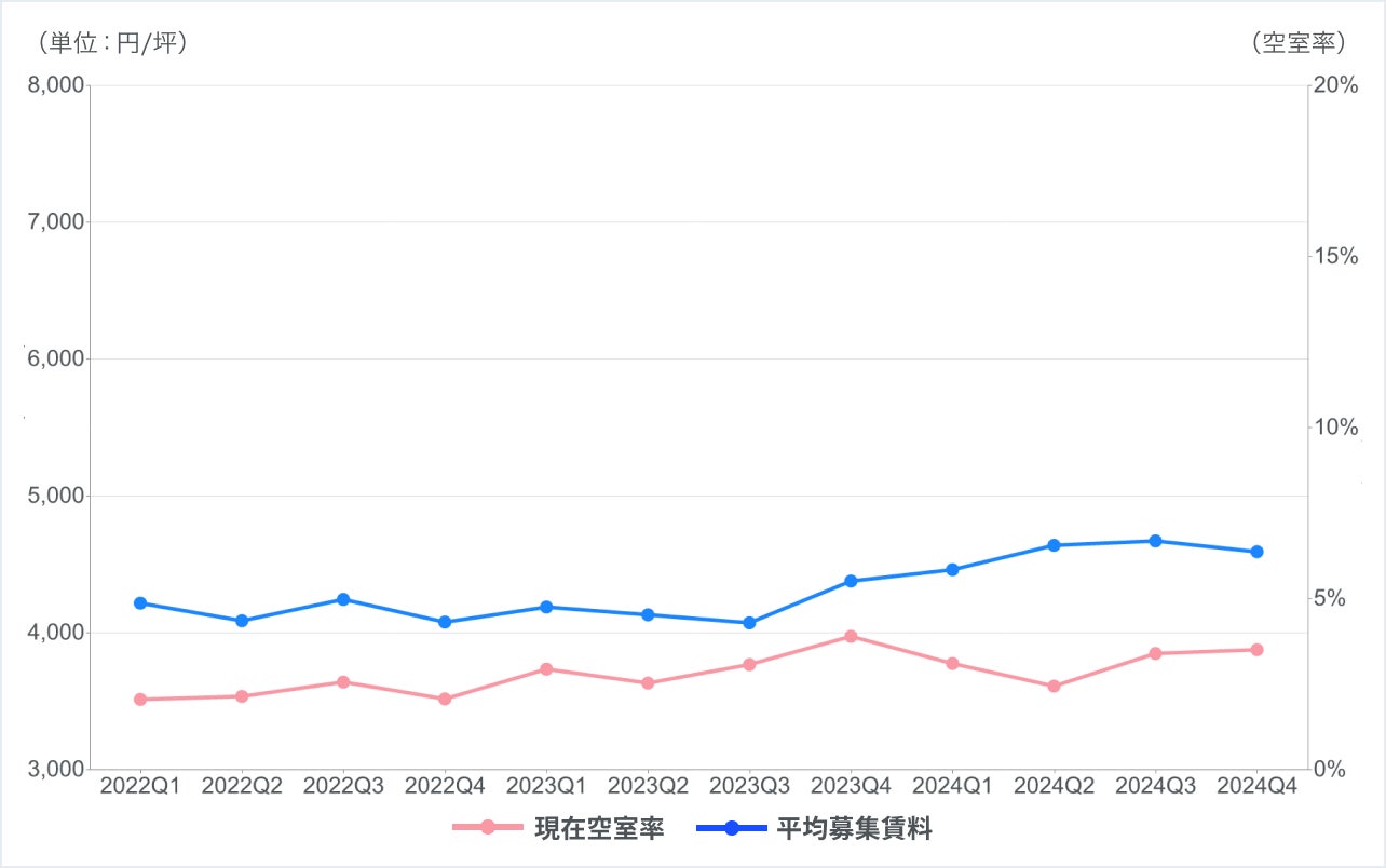 空室率は2024Q3で増加するも5%未満。募集賃料も増加傾向にあるも4,000円後半までで推移。